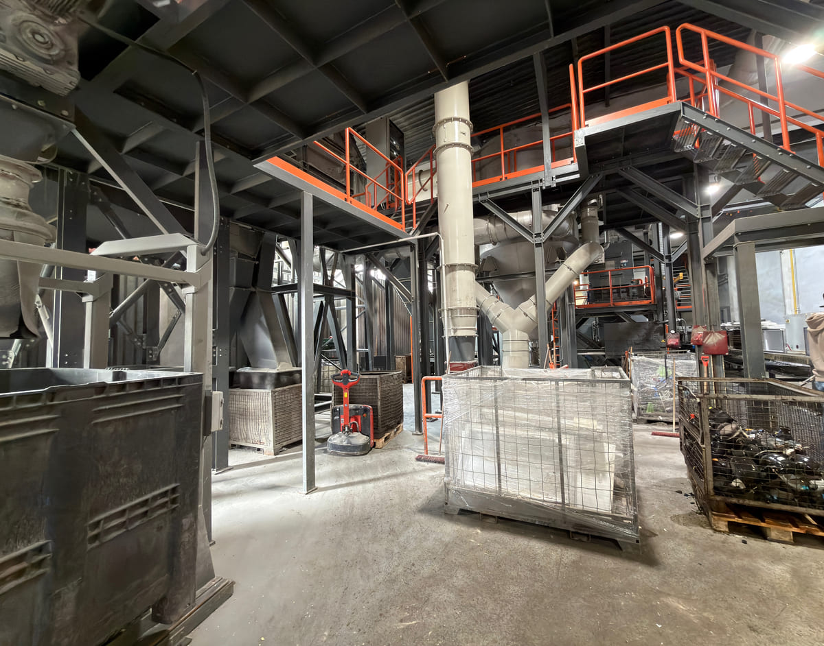 The integrated plant layout enablesthe processing of household refrigeration appliances under continuousindustrial operation with a maximum throughput of 3 tons per hour, whilemaintaining fire safety standards and ensuring a two-stage, efficientseparation of polymer and metal fractions.